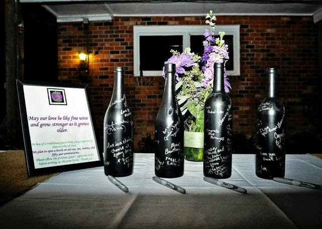 Wine bottles made for a fun guest book that the couple will enjoy for years.