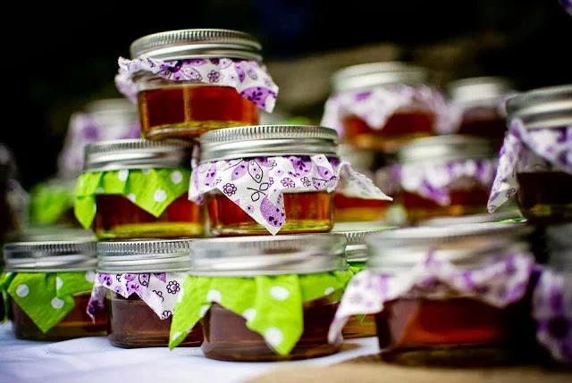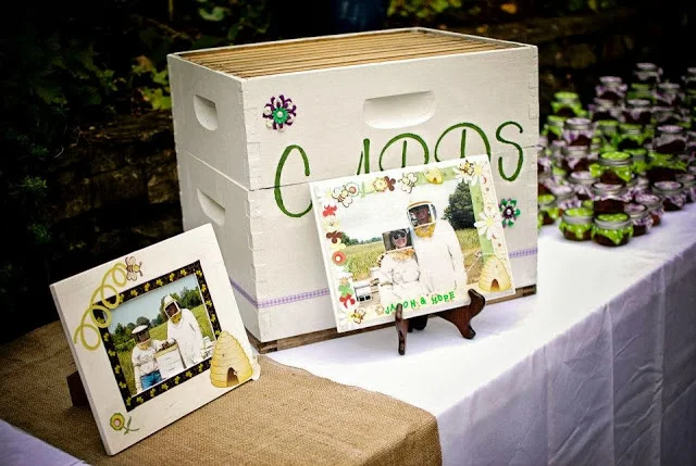 Since the groom worked with beekeeping, the favors were small jars of honey and the gift went into a bee box. So cute!