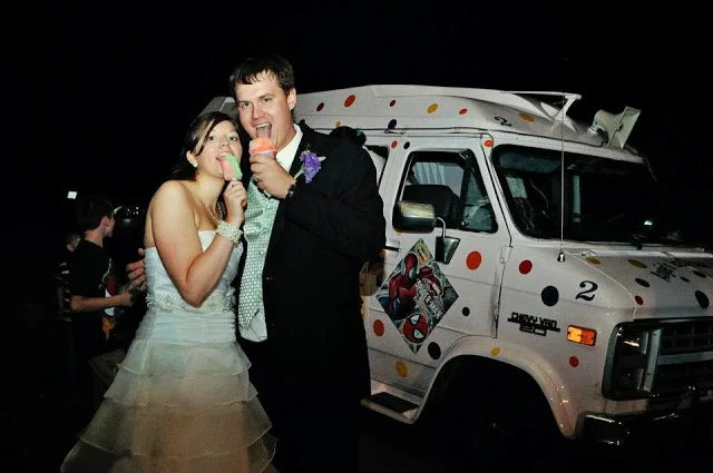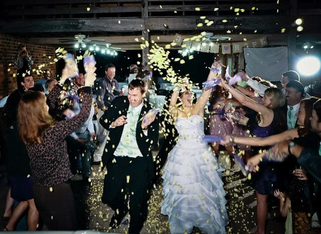 Instead of the traditional send off...the couple had guests throw popcorn.... it was a sea of popcorn coming down and the bride and groom loved it.