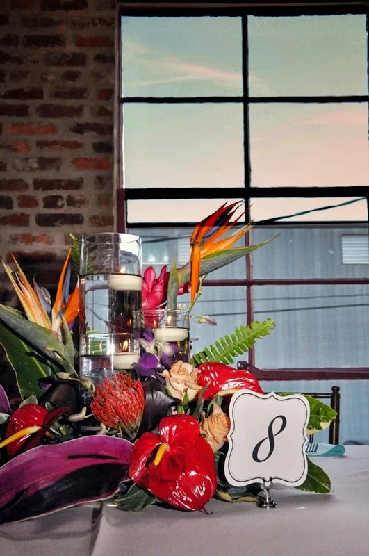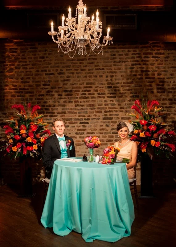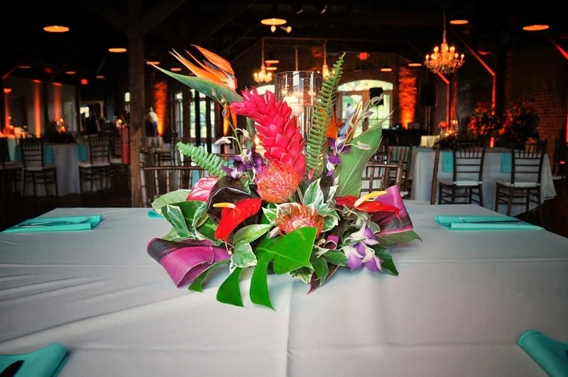 To incorporate her unique theme, the food was a custom Caribbean menu. Vivid colors in the linens and flowers also carried this theme. Multiple chandeliers were placed around Houston Station to add the elegant feel the bride envisioned. We used a mix of both round and square tables with chiavari chairs to continue the elegant but fun feel.