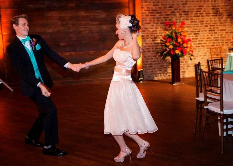 After dinner, the bride changed into her second dress of the evening. A short, fun silhouette in the same peach color.