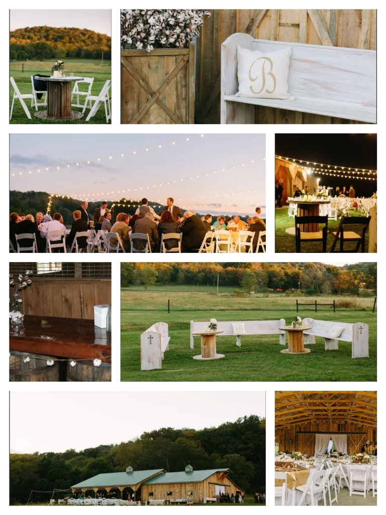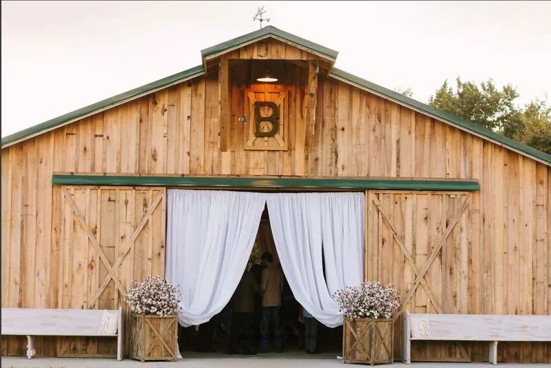 Old church pews were used as decorations around the barn with large boxes of cotton decorating the front draped barn entrance. Around the side of the barn was more pews and large spools setup for alfresco dining.