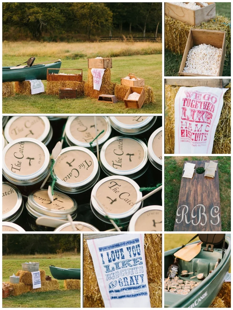 Afterwards everyone went to Grant's family farm where the reception was held. The cocktail area was setup with hay bales and wooden crates and boxes were filled with popcorn for a self-serve snack. A canoe with ice held signature cocktails in small jars with a fly fishing label.