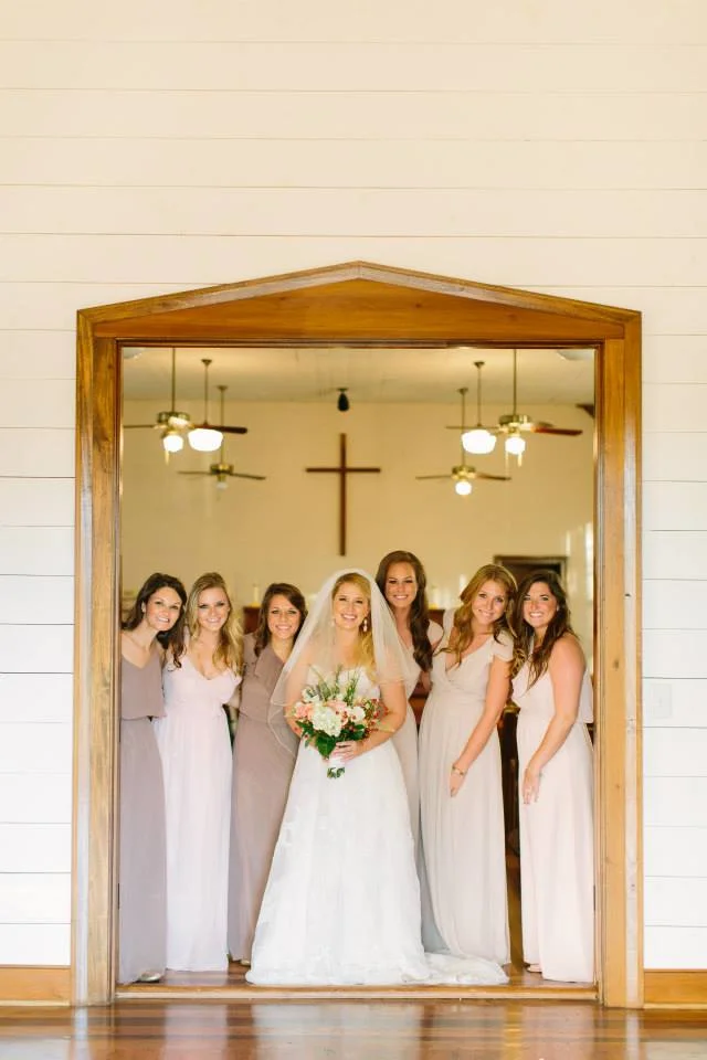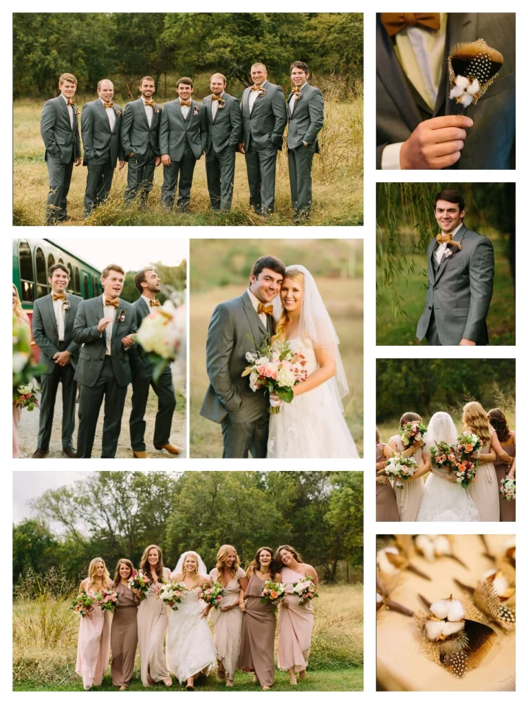 Rachel included so many details into her bridal party. The mismatched bridesmaids dresses were all long but in different styles and colors. But the combination of the beige and different shades of pink created a stunning effect. The groom and groomsmen in their gray suits and yellow bow ties with feather and cotton boutonnieres looked very dapper.