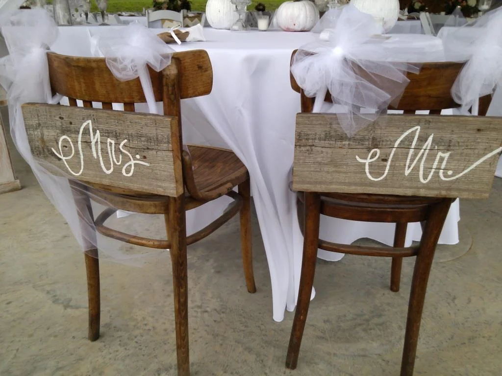 The head table was decorated with white Mr. and Mrs. pumpkins. The tables were decorated with alternating designs. One design had a gold and white chevron runner with lush, romantic pink, blush and white flowers in wooden boxes. While the other design was a runner gold deer heads on kraft paper with antlers around a wooden box filled with cotton.