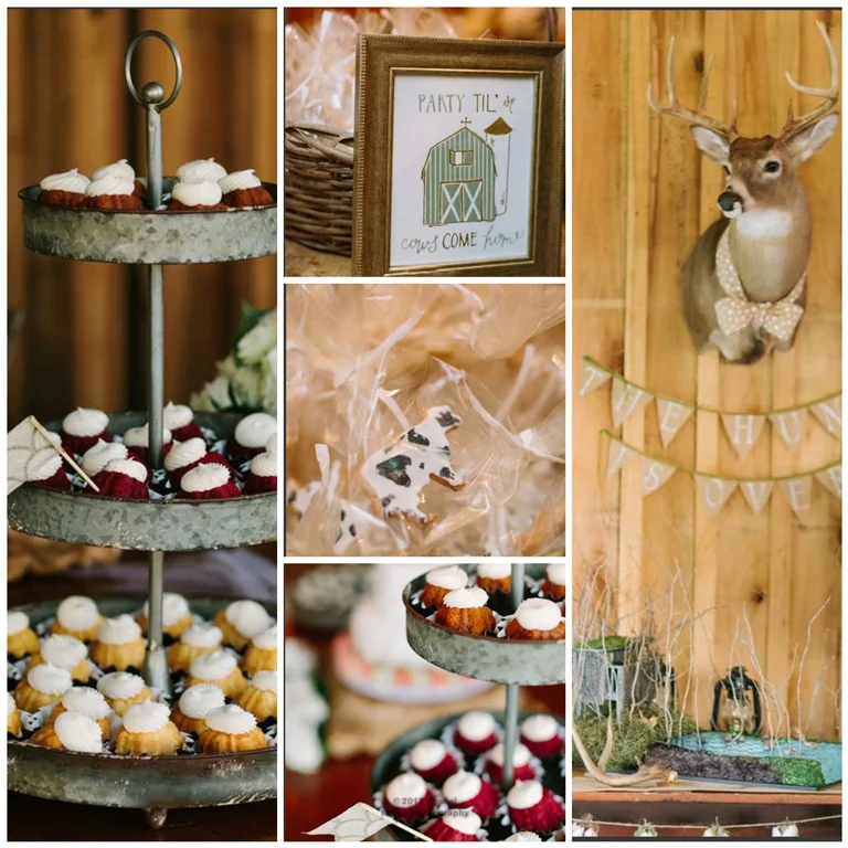 The brides cake was a white whipped buttercream decorated with pink and white roses and topped with wooden deer. The groom's cake was a duck blind. There were also assorted flavors of mini bundt cakes in rustic metal feeders for guests.