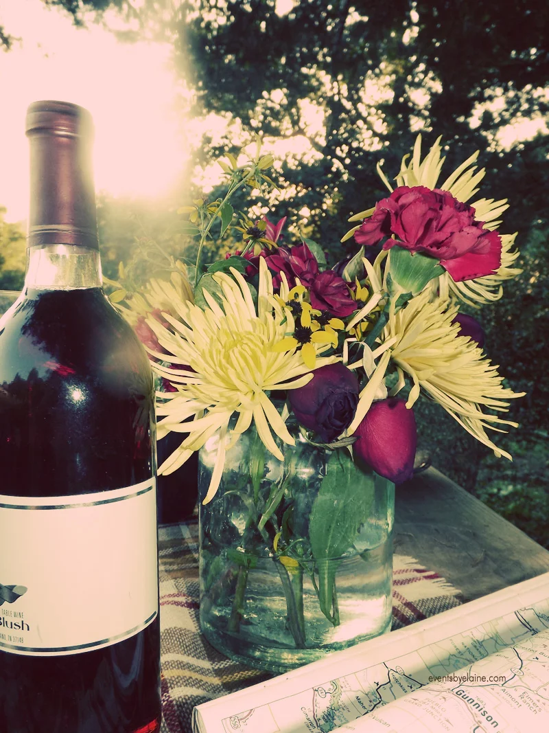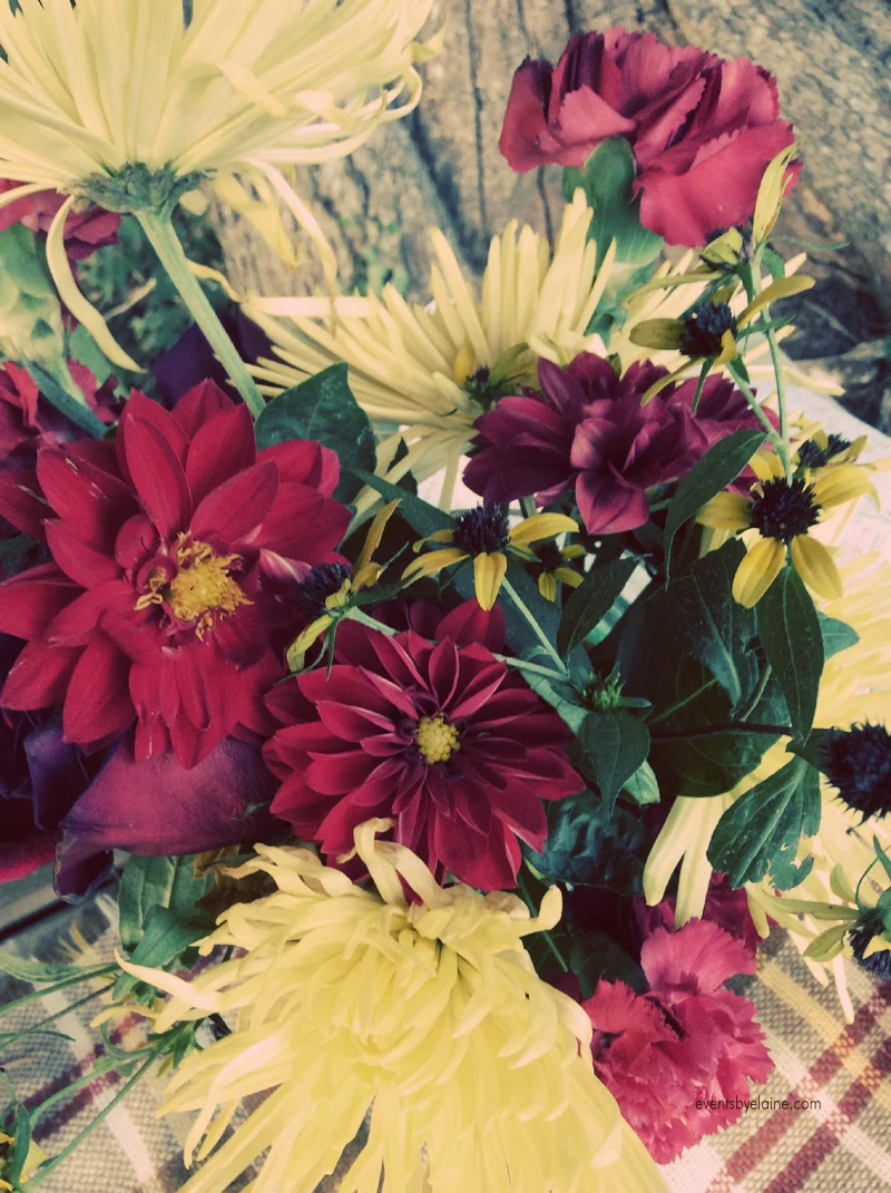 Flowers with red dahlias and yellow accents add charm along with some blue and brown plaid linens.