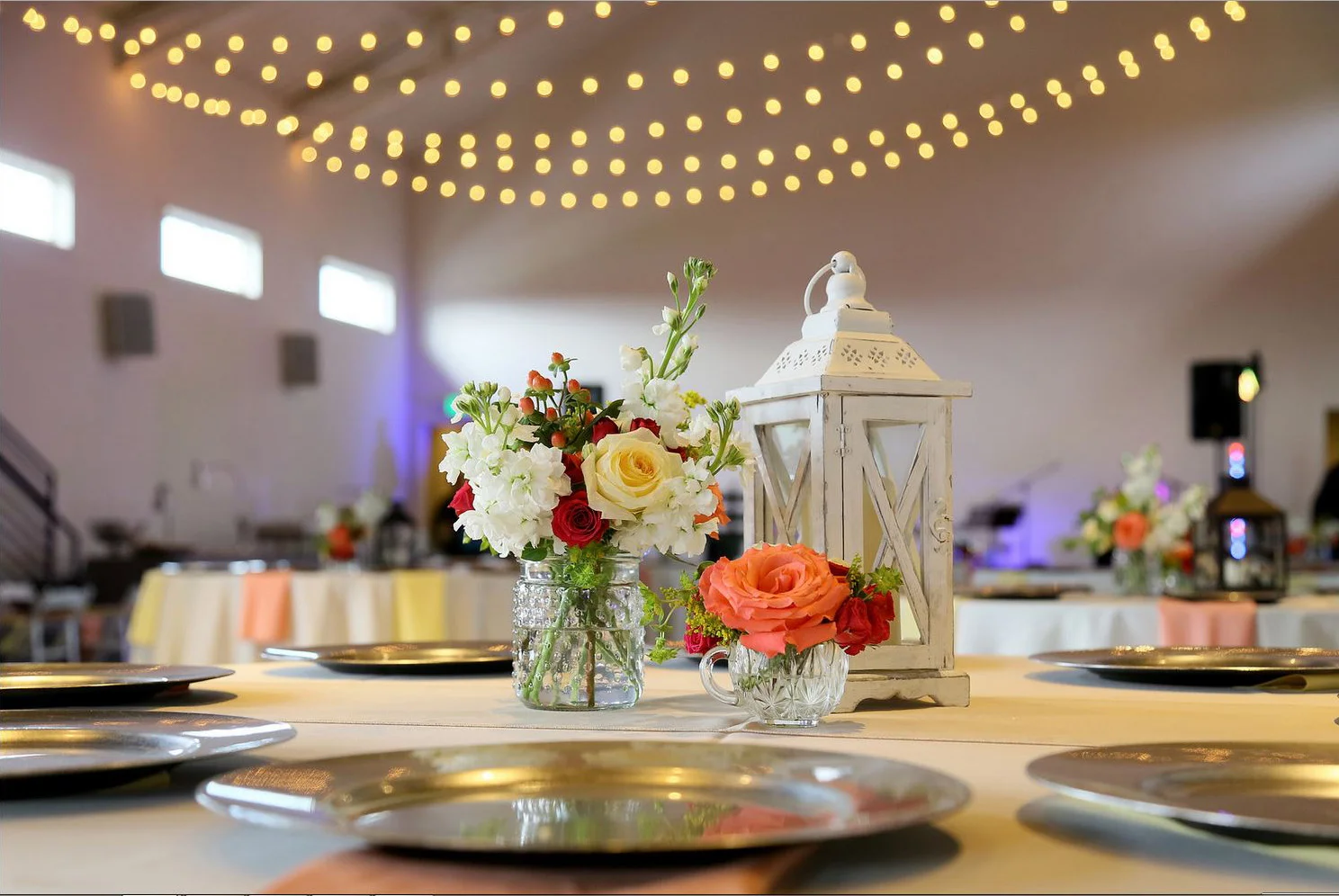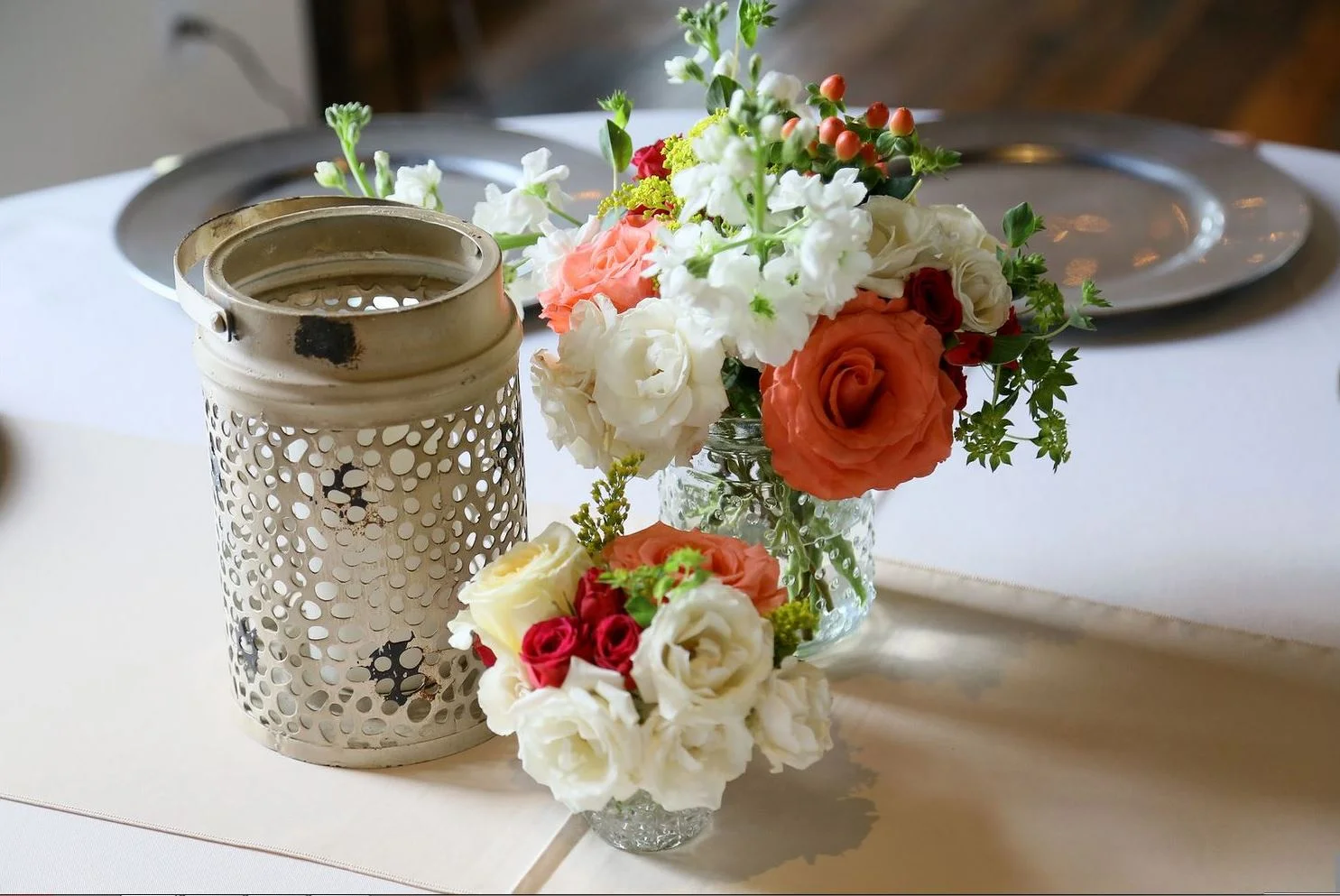 After cocktails on the patio, guests were greeted by a colorful, summer reception inside. The tables had champagne linens with alternating napkins. Lanterns and hobnail vases filled with beautiful roses filled each table.